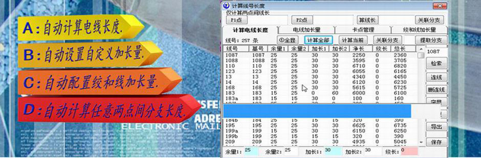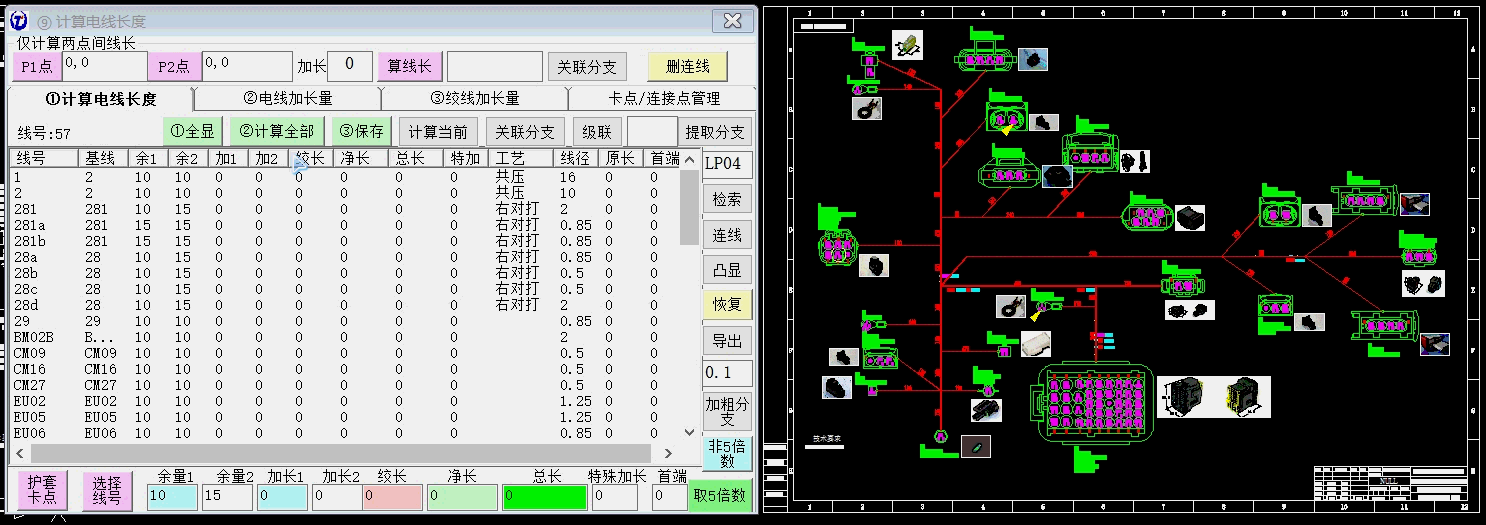 軟件完成圖紙內單線號打卡或共壓處理后,即進行電線長度(電線長度=兩端加工余量+經過分支長度+自定義加長量)計算。由軟件計算出數百根電線的下線長度,準確率為100%,從而將線束工程師從繁重的計算線長中解脫出來,把精力放在工藝優化等方面上來。