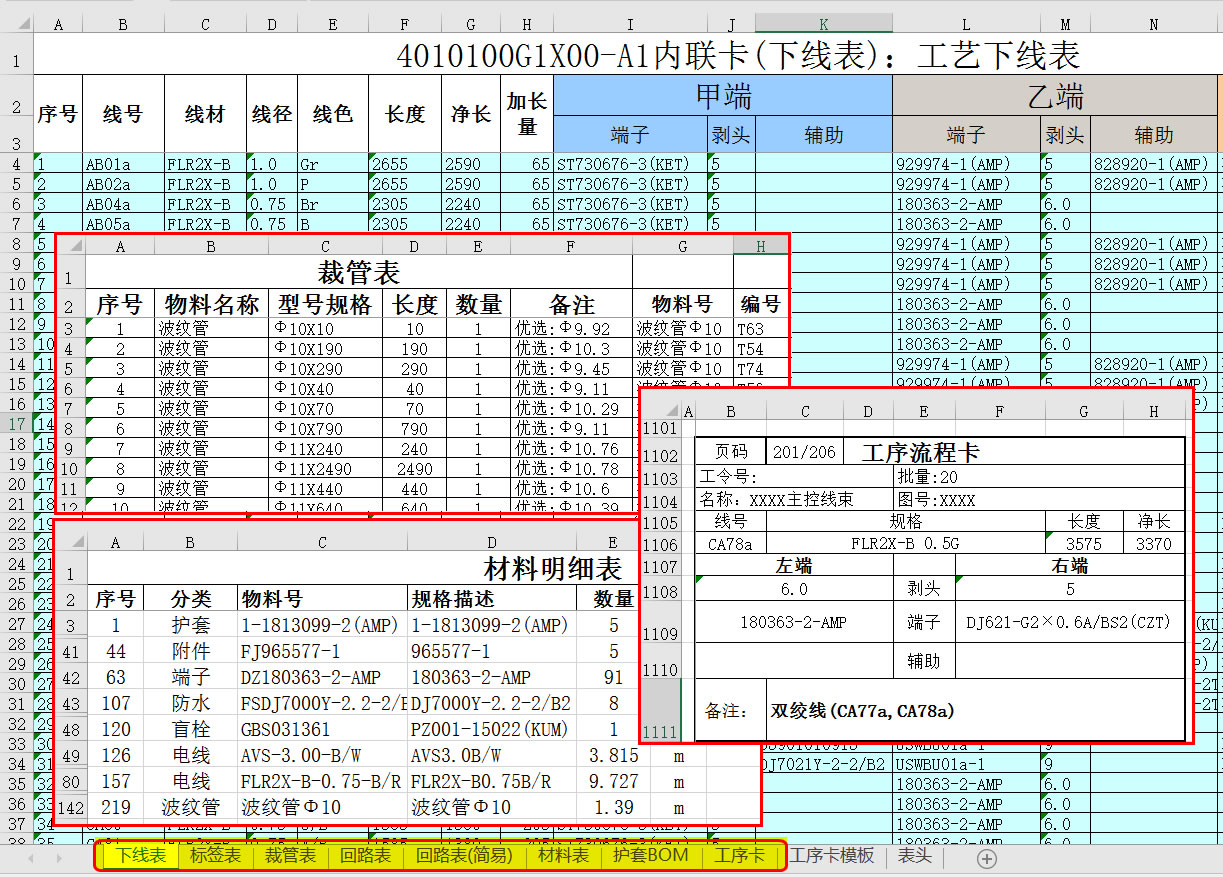 軟件自動生成工藝下線表、周轉卡、下管表、號碼管表、功能標簽表、導線標簽、線號回路表、卡點回路表、產品BOM等工藝技術表格,并按企業現有格式直接打印輸出。