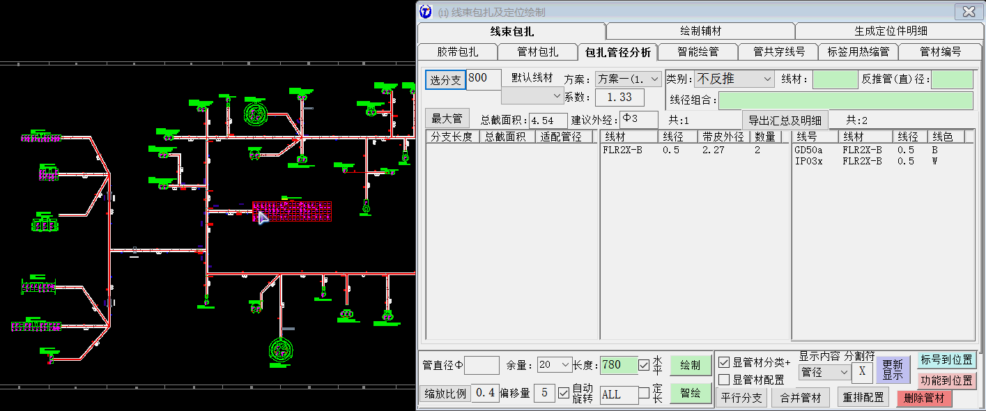 線束輔材主要指線束圖紙內包扎材料和各類定位裝置等材料,通過軟件能分析出經過任意分支的電線明細,由軟件計算出最佳包管直徑并快速繪制相應包扎材料到圖紙。軟件以模塊化和參數化的方法快速繪制圖紙包含的各類定位裝置(卡扣),并可統計到產品BOM內。