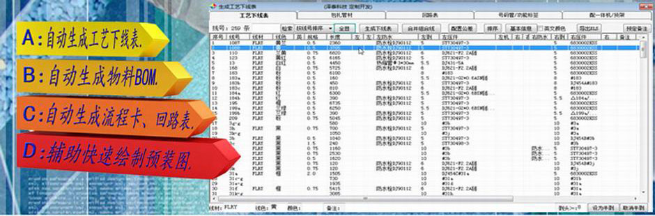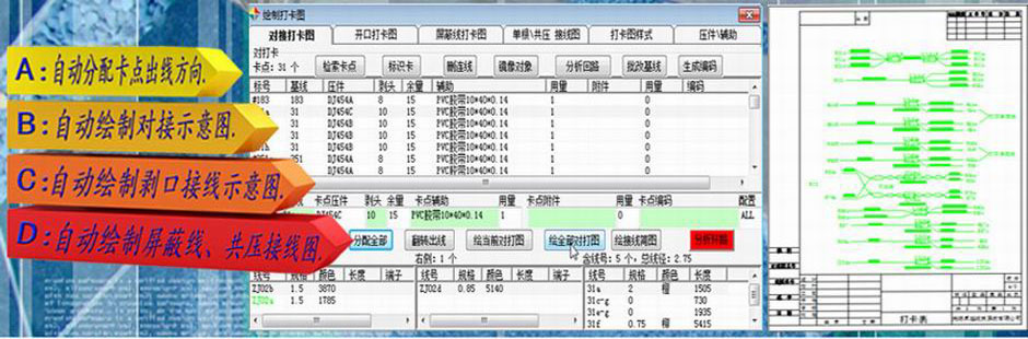 軟件自動匹配卡點壓件、輔助及打卡線號剝頭長度等工藝參數。另外軟件具有分支快速拆分、過渡線連接卡點設置、禁止打卡區域提醒等功能,在提高工作效率的同時也避免了遺漏線號等工藝錯誤。